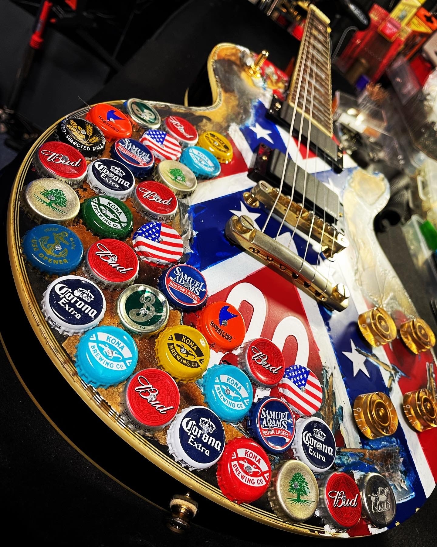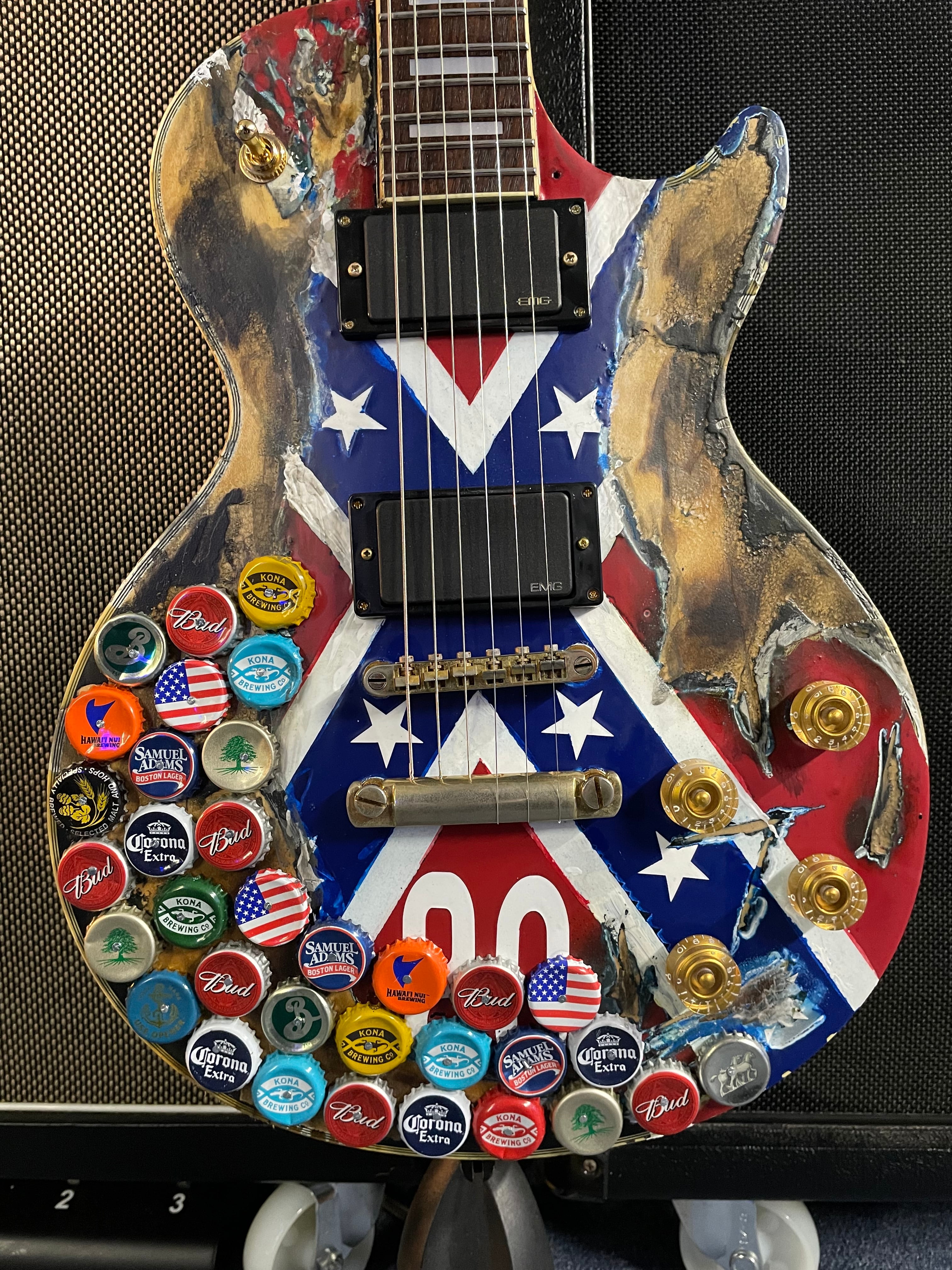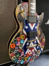 中古入荷したエピフォンのレスポールカスタムを弊社にてリフイニッシュ後にレリック加工とビールの王冠を打ち付け、zakkのRABELFRAGSを再現致しました。